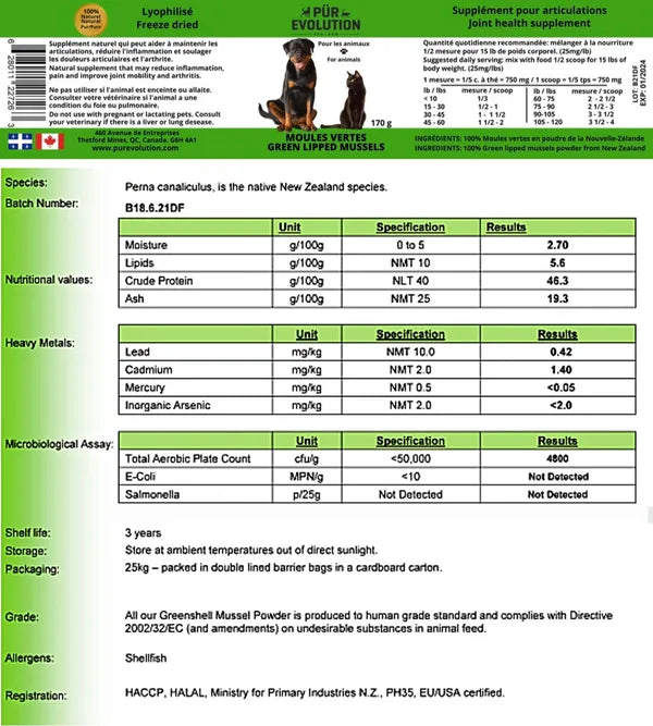 Notre poudre fine de la Nouvelle-Zélande est 100% naturelle et pure. Elle est également analysée et accréditée pour la consommation humaine et répond aux directives 2002/32/EC pour l'alimentation animale. Elle est également considérée HACCP, HALAL. La moule verte est reconnue Santé Canada. Empaquetée à Thetford, QC.
